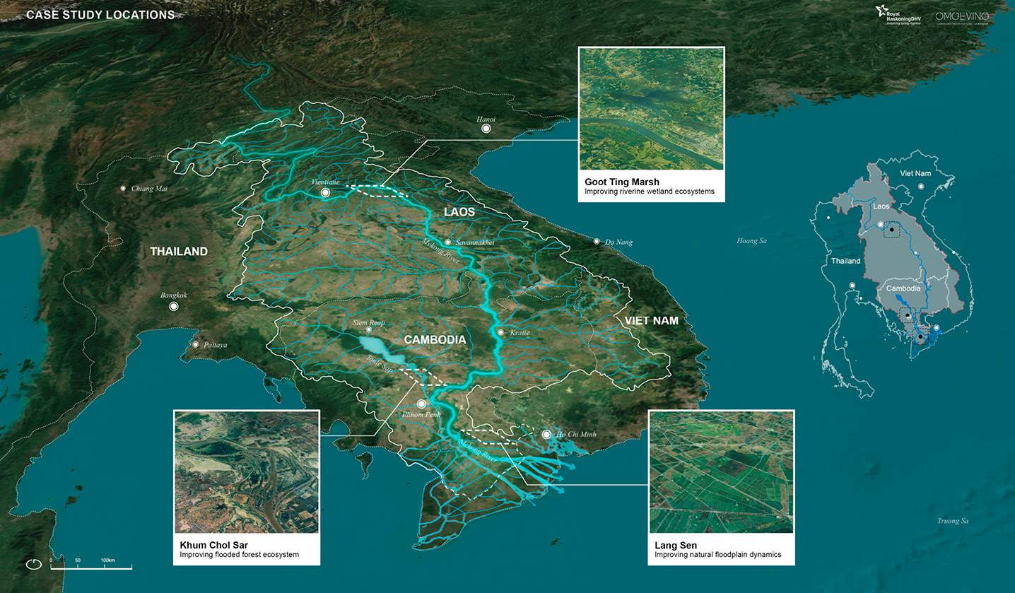 Please note that the three case studies differ in sub-floodplain conditions. Case 1(improving floodplain dynamics) involves a highly modified and high human population floodplain. Case 2 (improving riverine wetland ecosystems) involves wide functional floodplains. Case 3 (improving flooded forest ecosystem) involves the narrow mainstem and large tributaries floodplains of the Mekong middle reach.