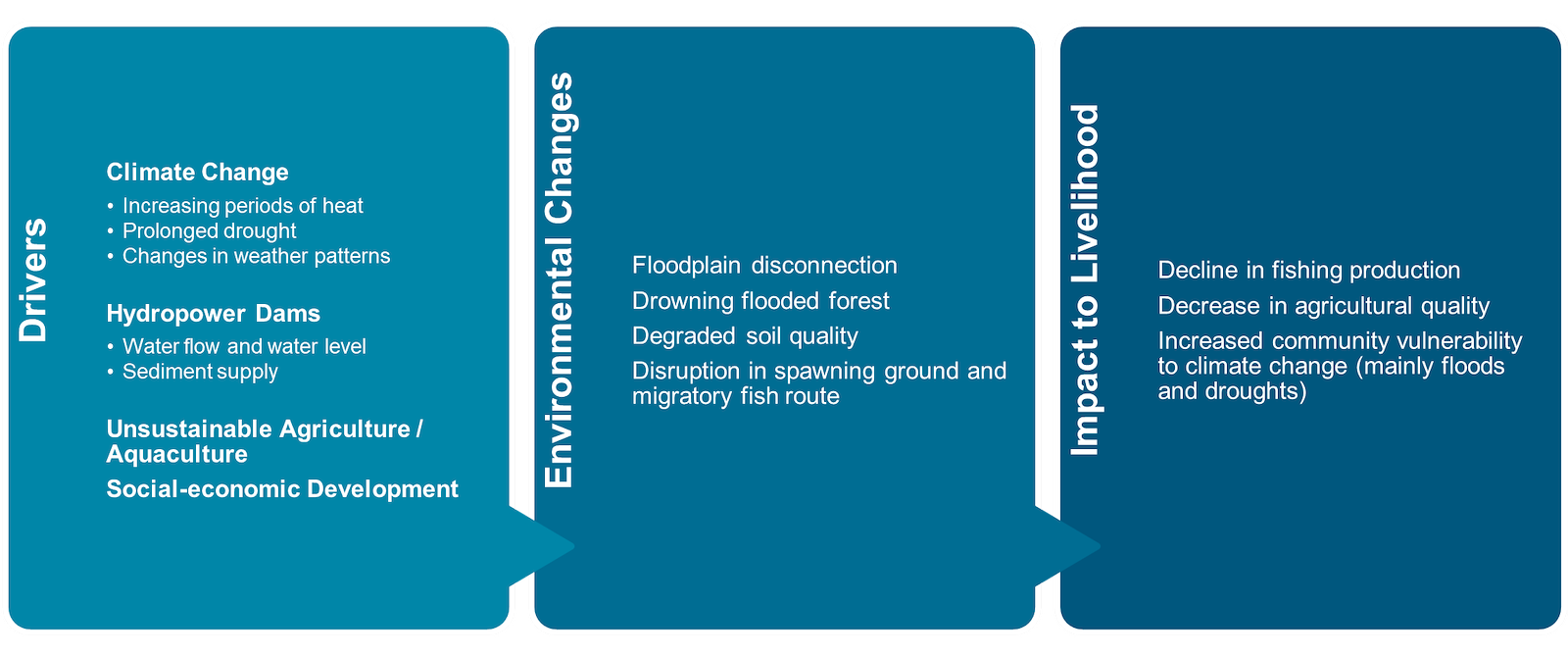 Despite its importance, the Mekong River faces various threats from the increased construction of hydropower dams, land use changes, and unsustainable livelihood practices that disturb biodiversity and riverine ecosystem. Additionally, climate change has impacted the Asian monsoon, leading to more frequent and severe floods and droughts. These events devastate crops and aquatic ecosystems, causing significant disruptions to rural livelihoods.