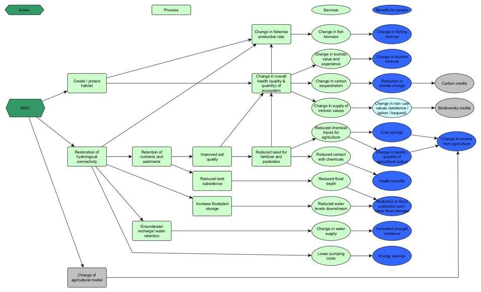 An effect that is not displayed in the figure below is the cost of the project. Implementation of the project comes with structural and non-structural costs for different stakeholders. Structural costs for the water system are generally borne by government organisations (though could be financed by other organisations), but ultimately are borne by society through taxes and fees. Non-structural costs are borne by government organisations, funders and farmers / households. Potential costs related to flood-based agriculture are related to: