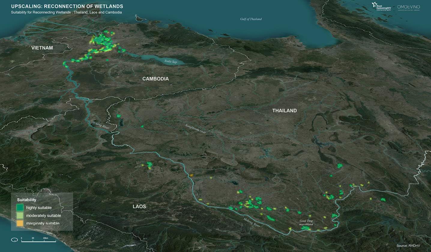 The map below shows the suitable riverine wetlands for reconnection. Wetlands in green are highly suitable for a reconnection.