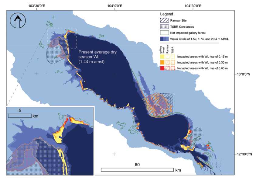 Kummu and Sarkkula (2008) used simulations to visually show potential inundation areas resulting from elevated dry-season water levels, with increments of 0.15 m, 0.3 m, and 0.6 m, as depicted in Figure below. In the Ramsar core site, covering 149 km2, the simulations suggest that 6% to 83% of the area could be affected. Similarly, within the Tonle Sap Biosphere Reserve, with a total area of 423 km2, the simulations indicate potential inundation of 13% to 42% of the total area. The key point here is that even small increases in dry-season lake water levels may lead to the permanent submersion of relatively large, flooded forest areas, possibly impacting aquatic productivity and posing a threat to the livelihoods of those dependent on the affected ecosystems, especially for the inland fishing community.