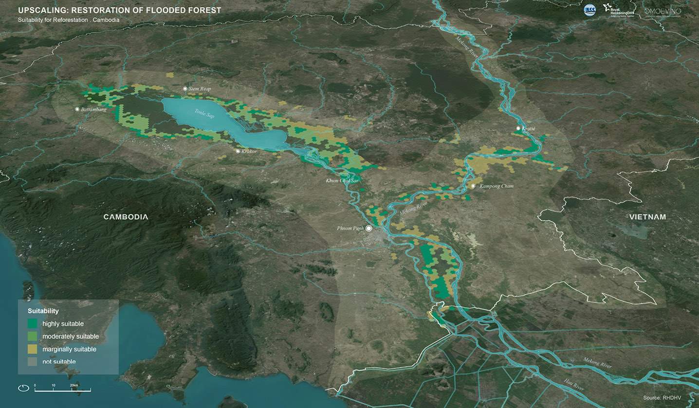 The map below shows the suitability of restoration of the flooded forest in Cambodia. Areas in dark green are highly suitable for reforestation. In general, the following areas have potential for reforestation projects: