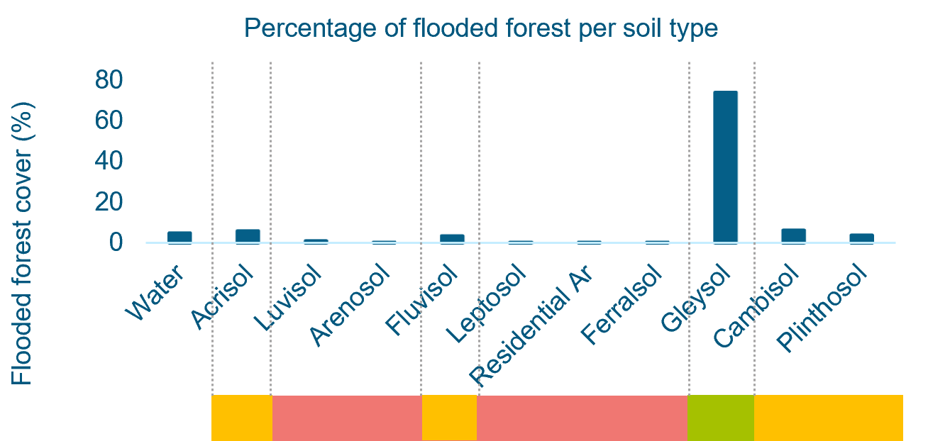 We combined the flooded forest land cover and a soil map to analyse in which soil conditions flooded forest thrives in Cambodia. The figure below presents the findings, illustrating the percentage of flooded forest coverage per soil type. This analysis has resulted in the following classification: