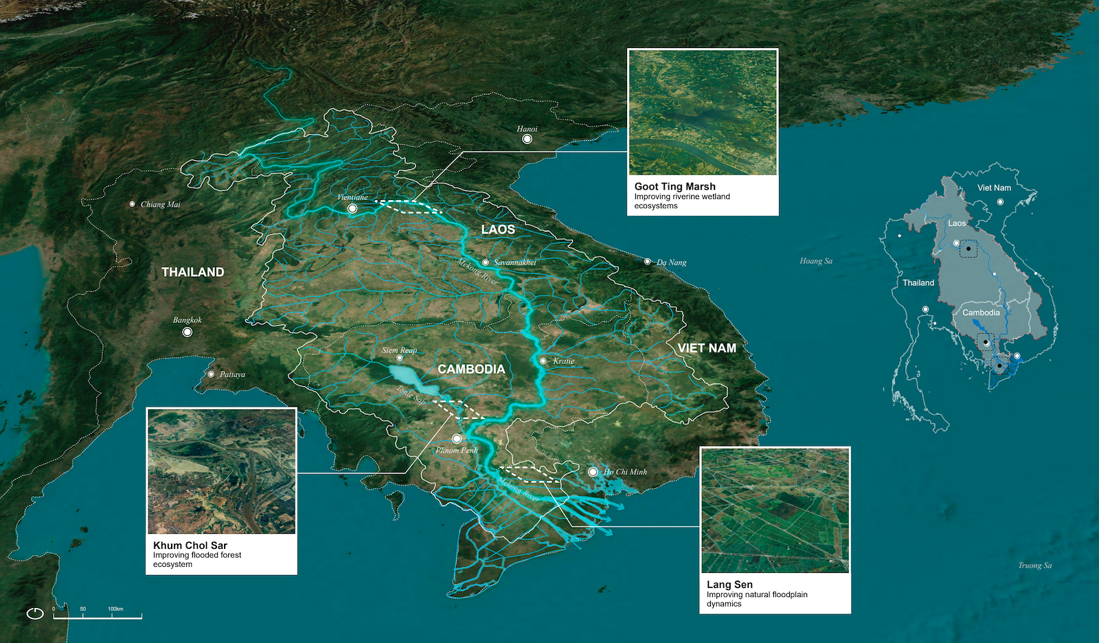 The implementation of reconnecting solutions varies significantly between regions with low human population and limited environmental changes, such as the vast plains of Cambodia, and areas with high human population and intense land use, like the Vietnam Mekong delta where natural processes have been completely disrupted. In the latter, business plans should include the benefits of floods and sediment. In traditional Khmer culture, average floods were viewed positively, while both low and high floods were seen negatively. Farming practices could be adapted to work with floods and sediment, using the floods as a natural irrigation method. By creating human-made openings in natural levees, farmers can control the flow of sediment into the fields, enhancing soil texture and nutrient content suited to specific crops. This could result in high yields with minimal use of fertilizers and pesticides, thus reducing labor and input costs. Reviving and modernizing these lost practices could have significant positive impacts on production resilience and overall system resilience.